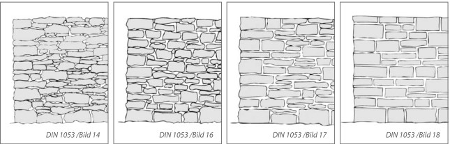 | MH8 | Bruchsteinmauerwerk, Bild 16/14/DIN 1053 | spaltrau | ca. 6 – 20 | ca. 15 – 20 | ca. 2,5 – 3 |
